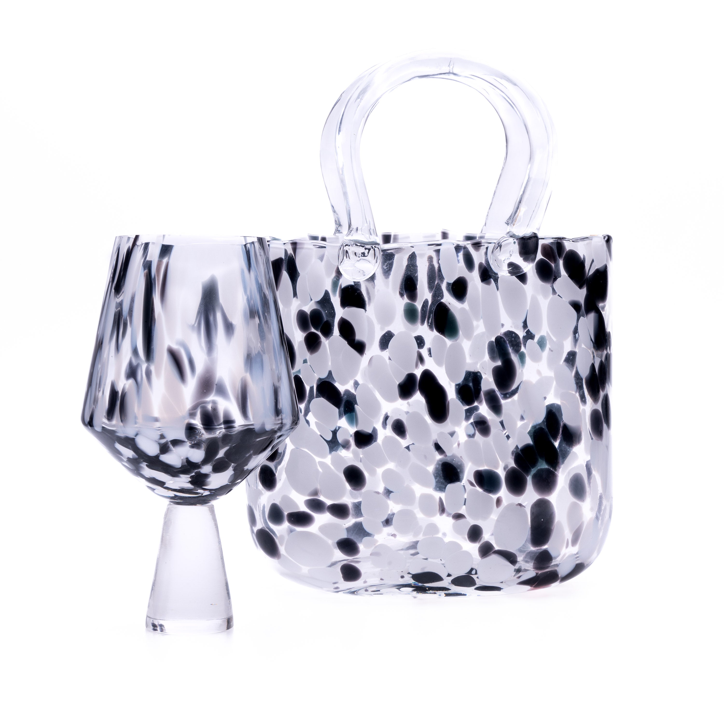Make a statement with this large Dalmatian print handbag vase and a matching set of two large drinking glasses. The bold black-and-white pattern and stylish handbag shape create a playful yet elegant look, while the oversized drinking glasses add a touch of sophistication. Perfect for home decor, interior designers, and gift businesses, with no minimum order quantity for easy stocking.