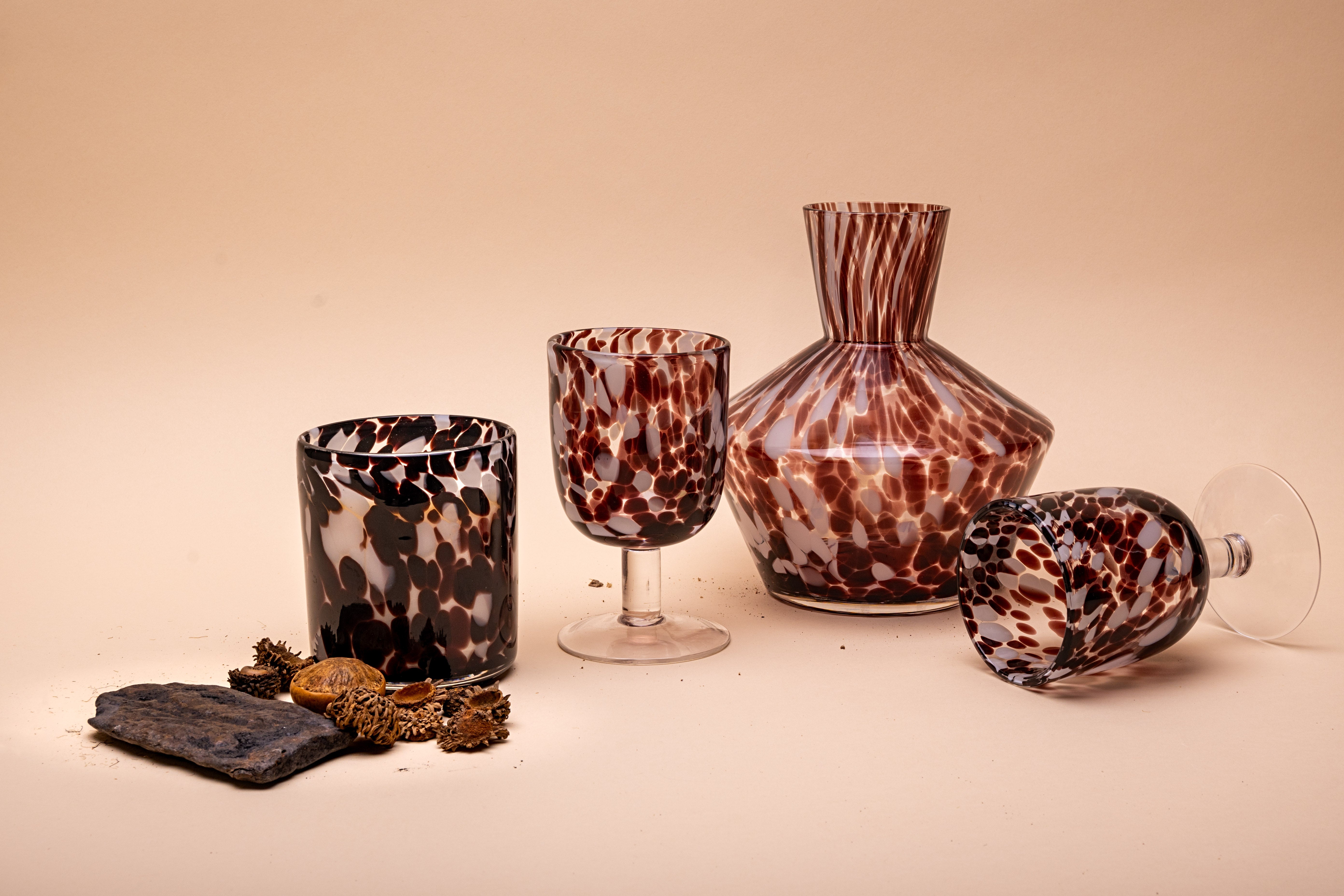 • Unique Design: The tumbler-shaped glass with a curved bottom and bold merlot fleck print is a visual delight.