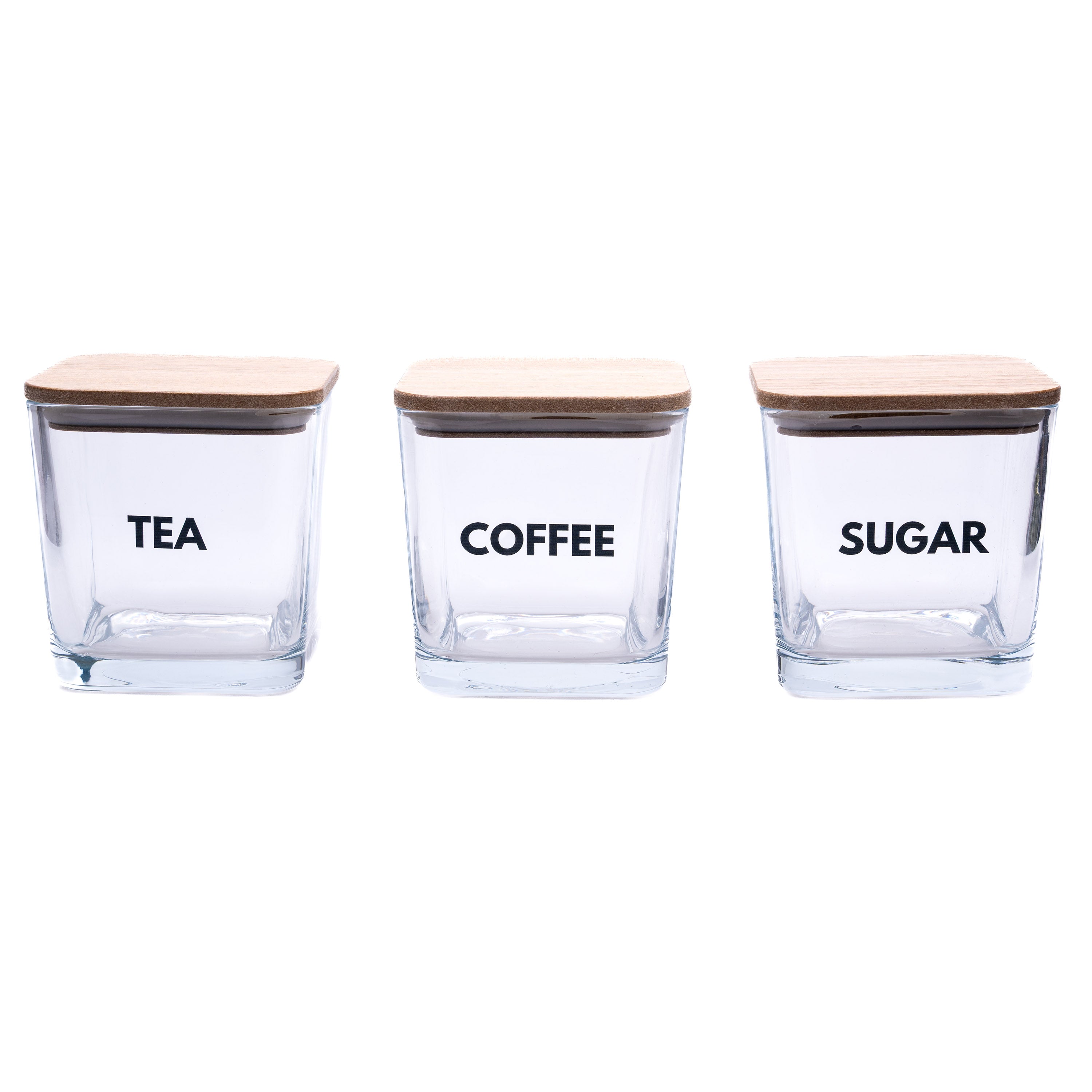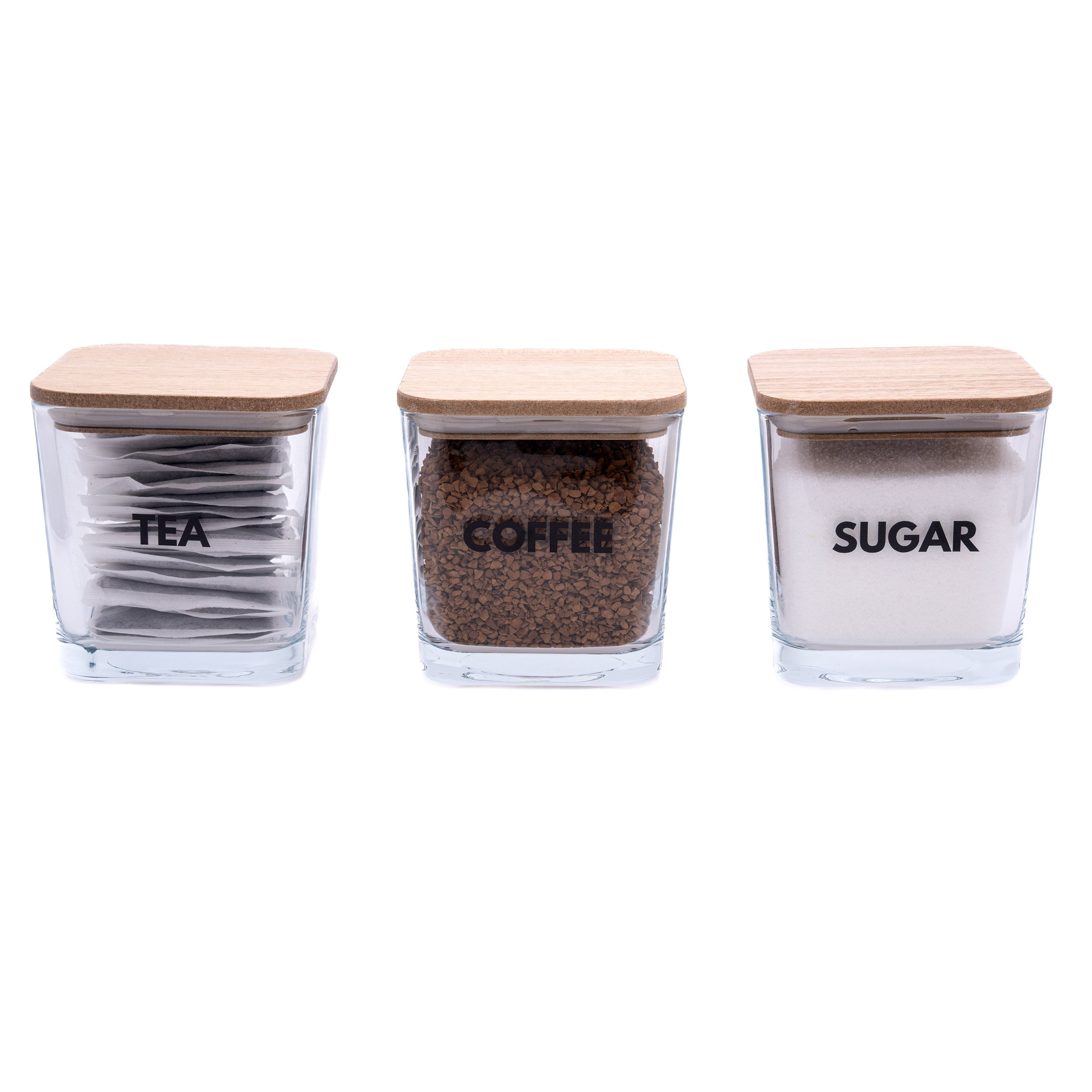 Crafted from thick, durable glass, each of the three cubes features a natural wooden lid for a warm, organic touch. The bold, black print labels ("Tea," "Coffee," and "Sugar") ensure practicality, while the clear glass design allows users to see their contents at a glance—making it easy to spot when it’s time for a refill.