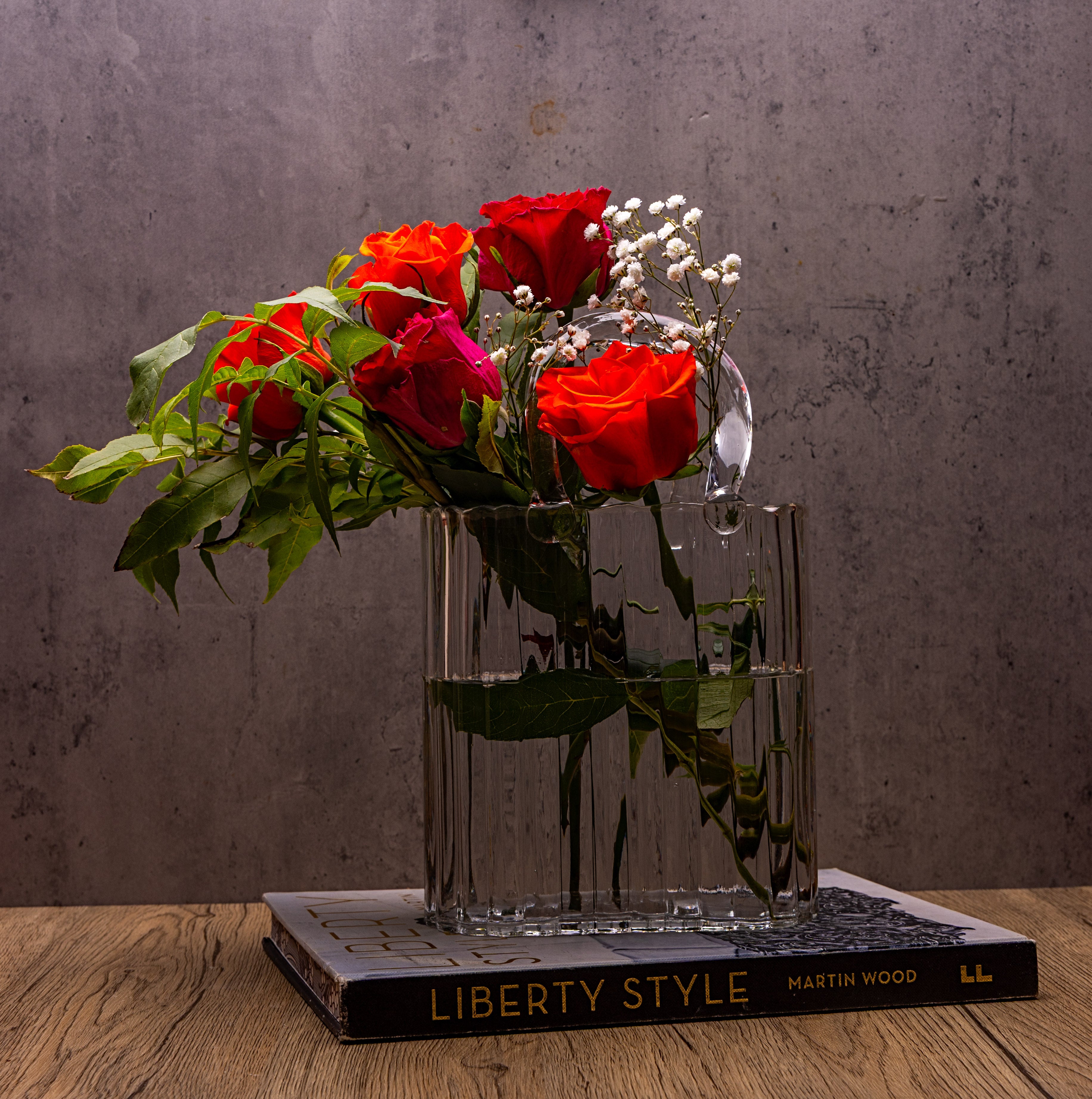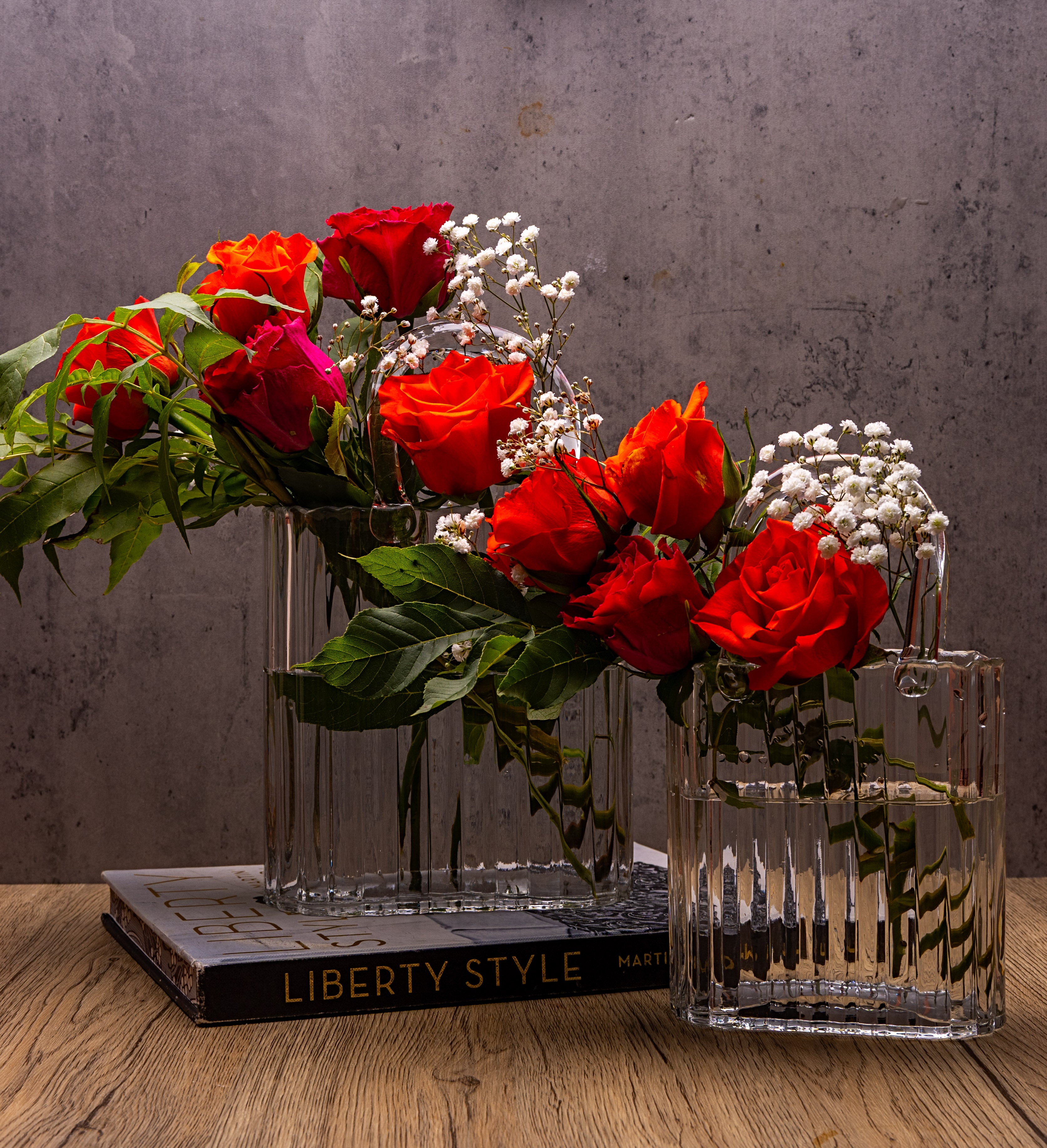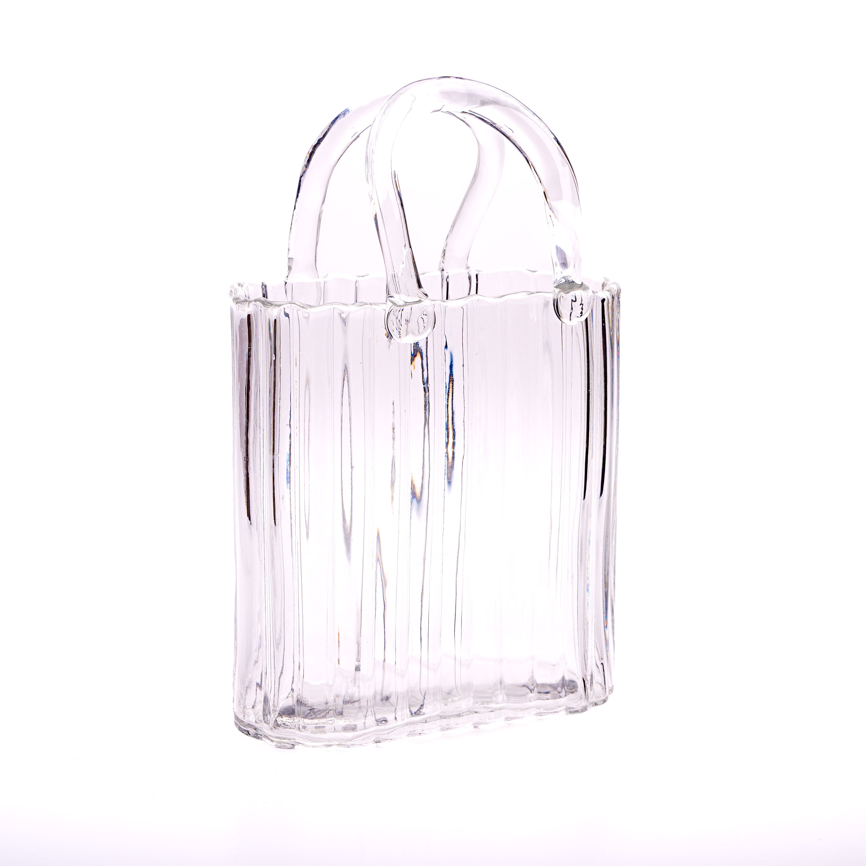 Style: Handbag-shaped vase crafted from transparent ribbed glass