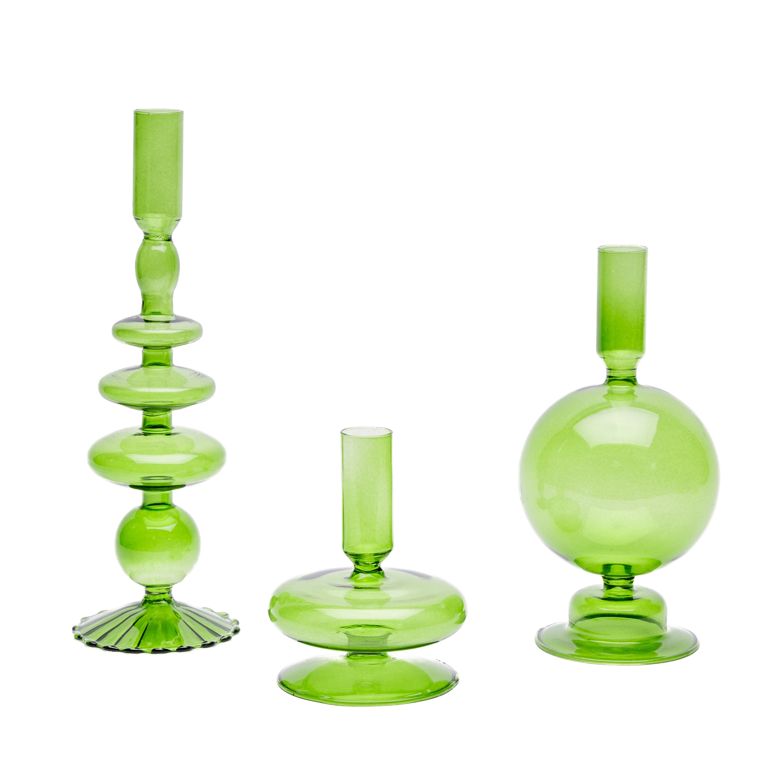 Three elegant pillar candle holders crafted from coloured glass in a captivating wine bottle green. These delightful holders are available in a range of sizes, bringing a touch of charm to any living space.