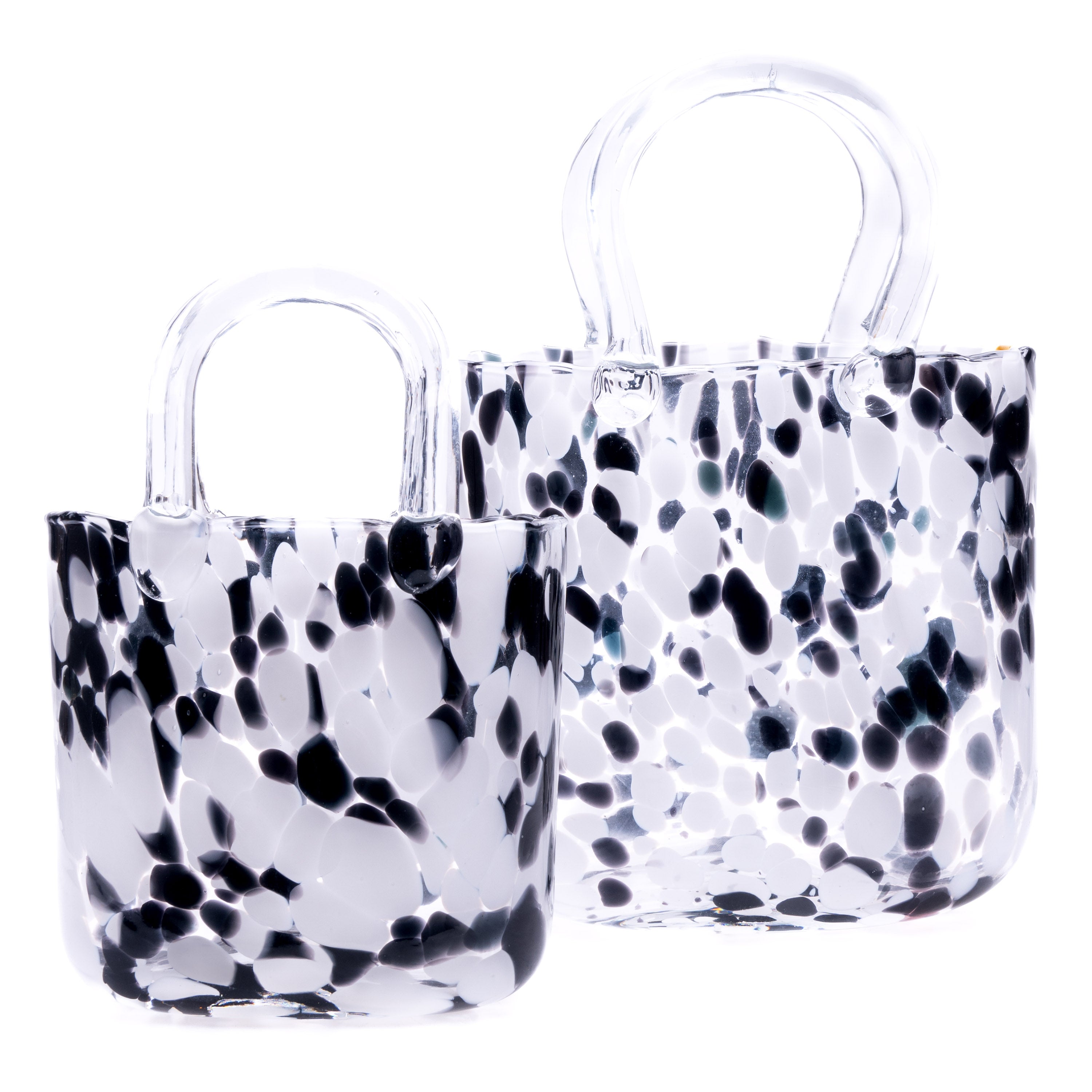 The beautiful Dalmatian print handbag vase is available in large and small sizes. Its black and white speckled design makes it versatile, fitting seamlessly into any colour palette. Whether you want to display bold, vibrant flowers or use it as an eye-catching piece of decor, this unique vase is perfect for either scenario.