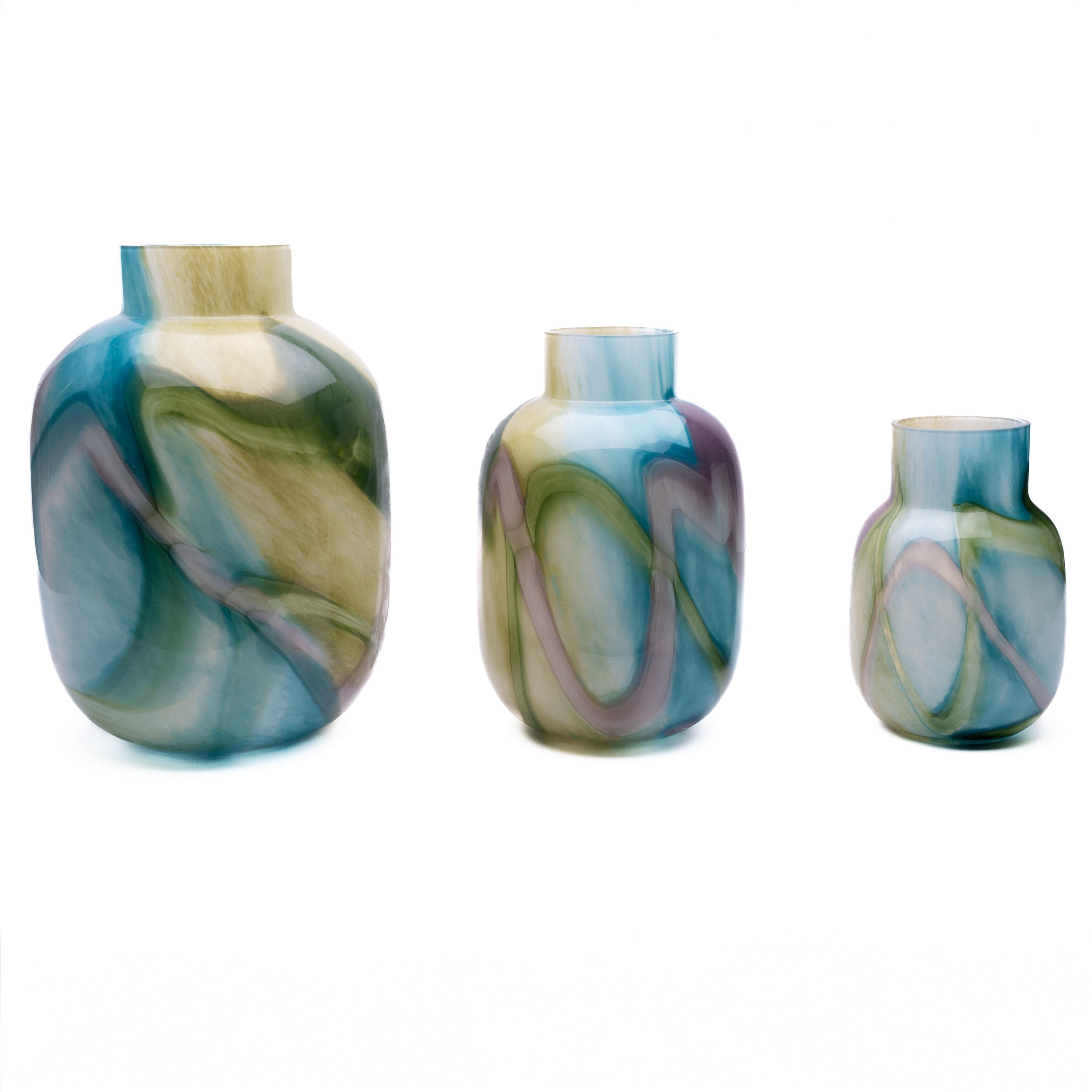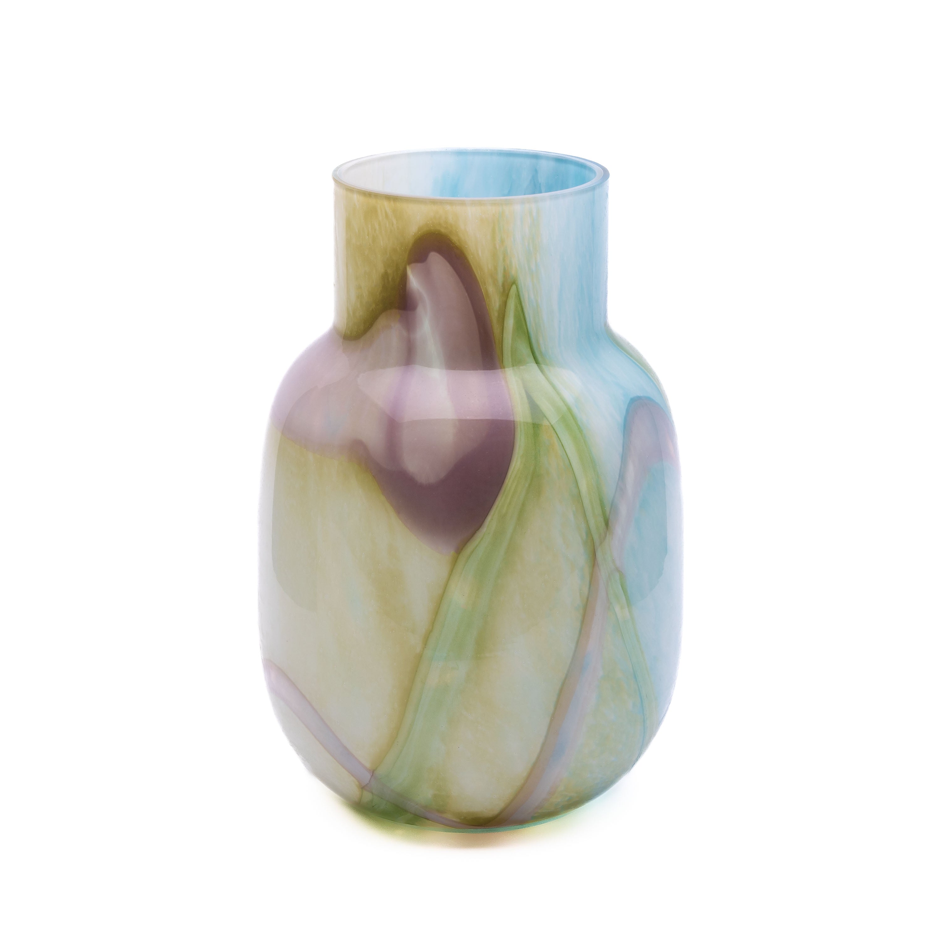 Elevate your home decor with a small pastel swirl vase. This charming round glass vase showcases an enchanting marble effect in delightful green, pink, and blue shades, bringing a unique and vibrant touch to your living space.